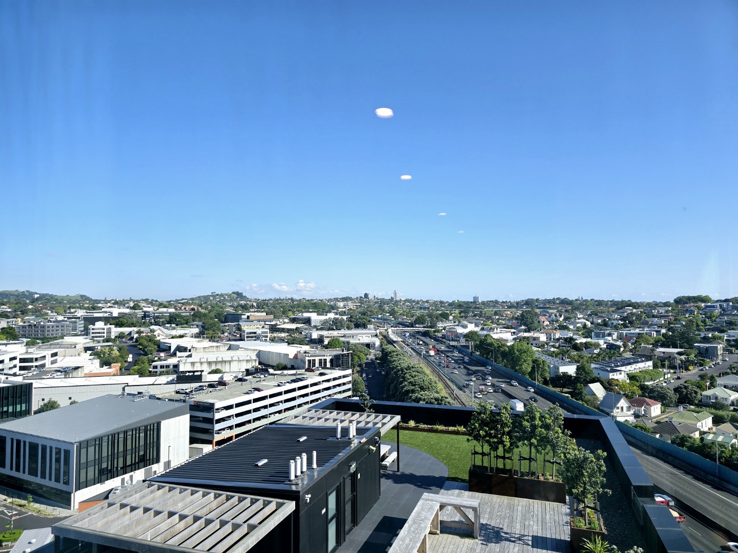 You look over the huge rooftop outdoor area, and beyond.