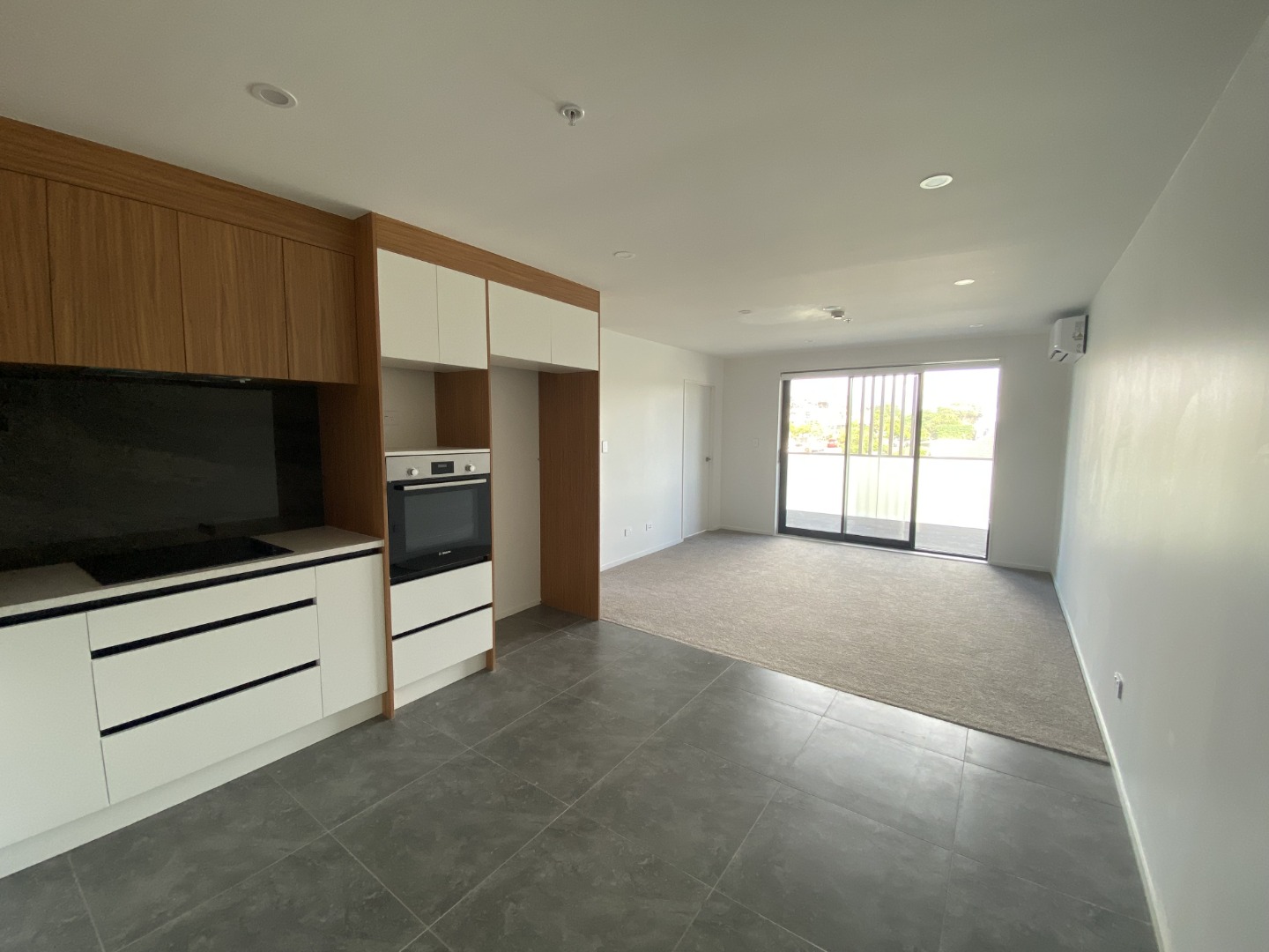 Large open plan kitchen, living and dining with access outside via a ranch slider door.