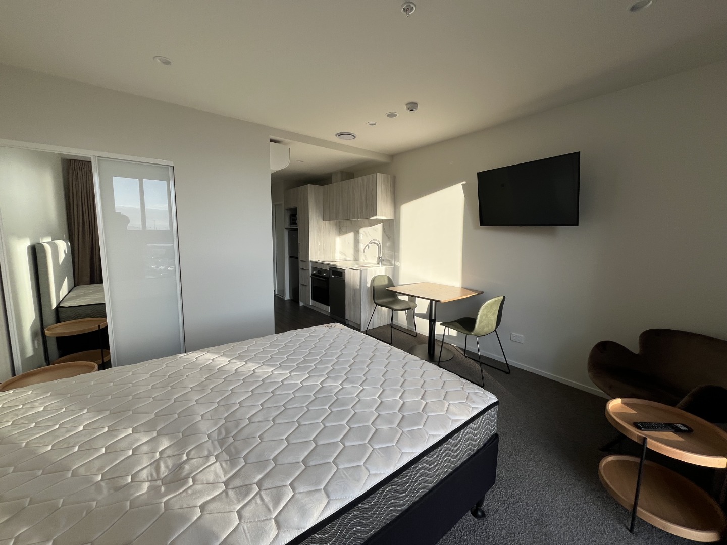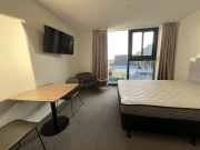 This studio apartment is a generous size all open plan, separate full size bathroom and full size kitchen.
