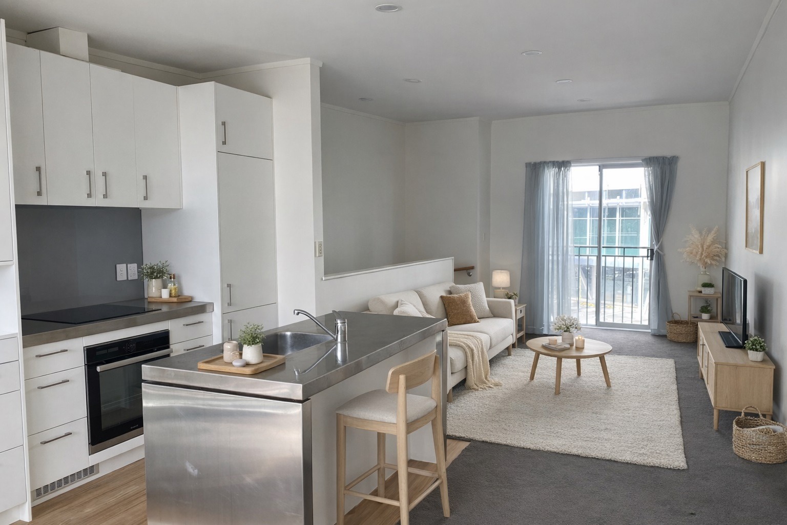 Upstairs, the light-filled living area flows into a kitchen with ample bench space and opens onto a sunny balcony, perfect for morning coffee or evening relaxation.