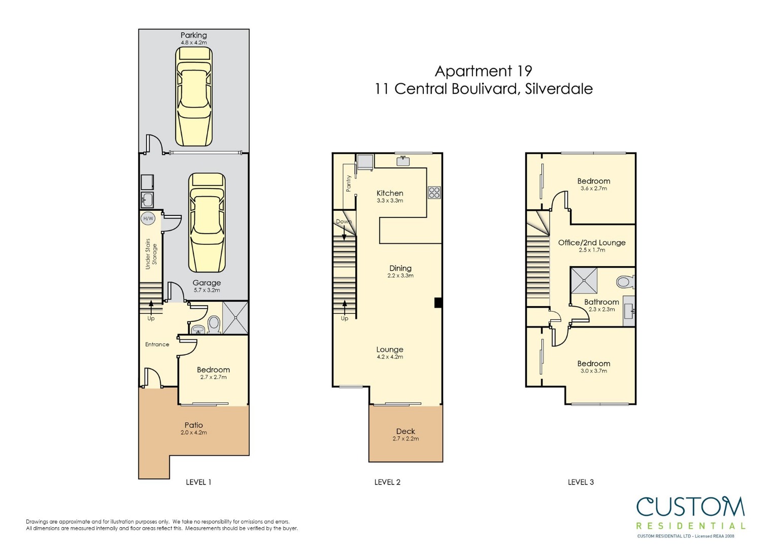 Three levels with an office/guest bedroom on the ground floor with own ranch slider access to a small landscaped courtyard, complete with separate bathroom and shower, oversized front door entry and single internal access secure garage (with additional parking space in the driveway).